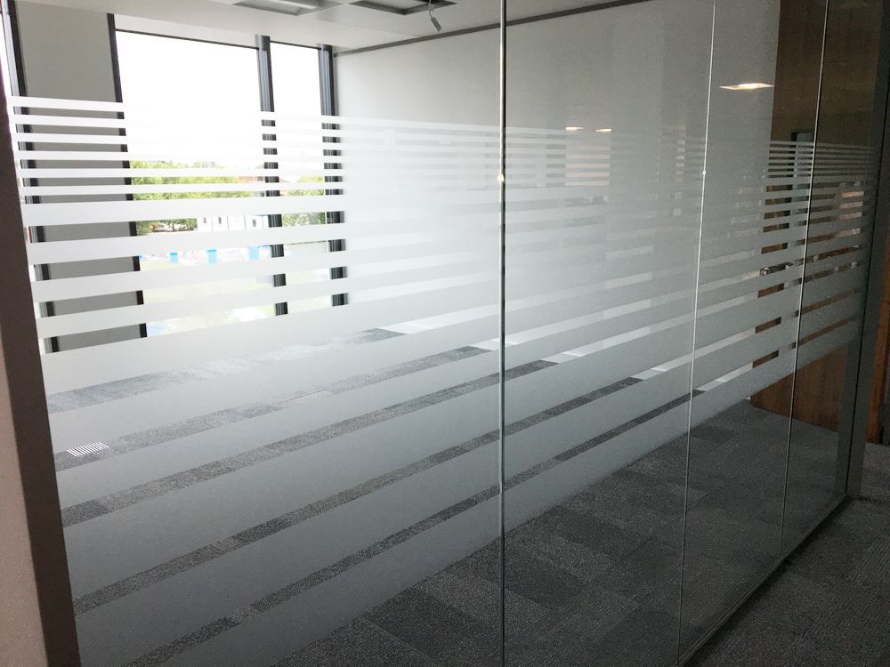 Frosted effect vinyl can be cut down into simple blocks or bands. Bands are generally a standard of 1200 mm high by the width of your glass panel. This will generally be centred onto the glass giving a band of privacy but still allowing vision above and below of the band. This can be in Opal frost effect, crystal effect, silver etched effect or printed patterns. As you will see from our images, the bands can be multiple and different heights. Frosted bands tend to be thinner than blocks and are usually multiple across the glass, patterns can be made from bands at multiple thicknesses and multiple size gaps between the bands. This can create different effects like graduated patterns and blind effects. All of the patterns created from block and bands are bespoke and can be tailored to for your partition glass and windows. Blocks and bands can be combined to make even more pattens which you will see in our images.