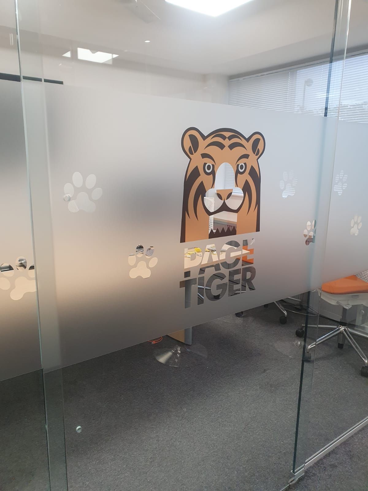 Frosted effect vinyl can also be printed onto with colour patterns or logos for corporate branding. When the patterns or logos are printed onto the frost effect vinyl, it still allows light to pass through giving a translucent effect from both sides. With the printed effect there are endless possibilities for patterns logos and even images. Logos can also be added to the frost effect vinyl in coloured cut vinyl for a less translucent effect.